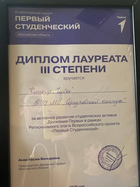Студент 1 курса Серпуховского колледжа группы 1752 специальности «Туризм и гостеприимство» Даниил Щербаков (классный руководитель Т.А. Артеменкова) в составе команды «Чайки» был награждён Дипломом лауреата III степени на Региональном этапе Всероссийского конкурса «Первый Студенческий», который состоялся в г. Мытищи.