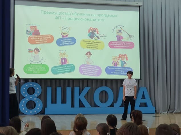 65 обучающихся 9 классов узнали об особенностях получения образования по программе «Профессионалитет». В начале мероприятия прозвучал Гимн СПО, затем амбассадоры, представив красочную презентацию, рассказали о колледже, специальностях и преимуществах студентов Профессионалитета. Квиз, игры, ответы на интересующие вопросы – всё это поддерживало интерес ребят в течение всего мероприятия. Ребят пригласили на Единый день открытых дверей, чтобы лучше узнать колледж, послушать выступления работодателей, поучаствовать профессиональных пробах. Такие встречи важны: они позволяют школьникам определиться с выбором будущей профессии.