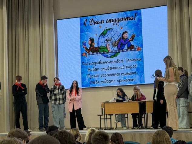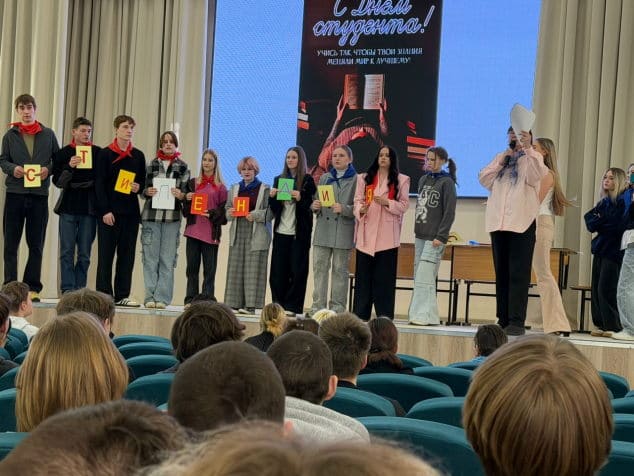 Ведущие — Кондратенко Полина (группа 0951) и Закирова Динара (группа 1251) - рассказали об истории празднования Дня студента и поздравили всех присутствующих, создав атмосферу веселья.