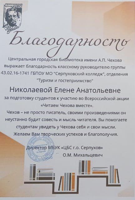 ⚡Студенты группы 43.02.16 -1741 Туризм и гостеприимство со своим классным руководителем Е.А. Николаевой посетили краеведческий лекторий в Центральной городской библиотеке. ?Встреча была посвящена дню рождения Антона Павловича Чехова, творчество которого — это ?уникальное явление в русской и мировой литературе. Говорили о юмористических рассказах, полных искрящегося смеха, тонкого, умного юмора. ❗Студенты колледжа приняли активное участие во Всероссийской акции «Читаем Чехова вместе». Девушки прочитали отрывки из своих любимых произведений Антона Павловича: ?Бакаева Светлана - повесть «Палата № 6»; ?Баранова Ангелина - рассказ «Крыжовник»; ?Борисенко Екатерина - пьеса «Дядя Ваня». Центральная городская библиотека благодарит всех участников и организаторов акции. ☝Надо отметить, что студенты, обучающиеся по специальности «Туризм и гостеприимство» - постоянные читатели отдела краеведения. Это помогает им в изучении спецдисциплин, например «Освоение профессии «Ассистент экскурсовода(гида)». До новых встреч в библиотеках…?