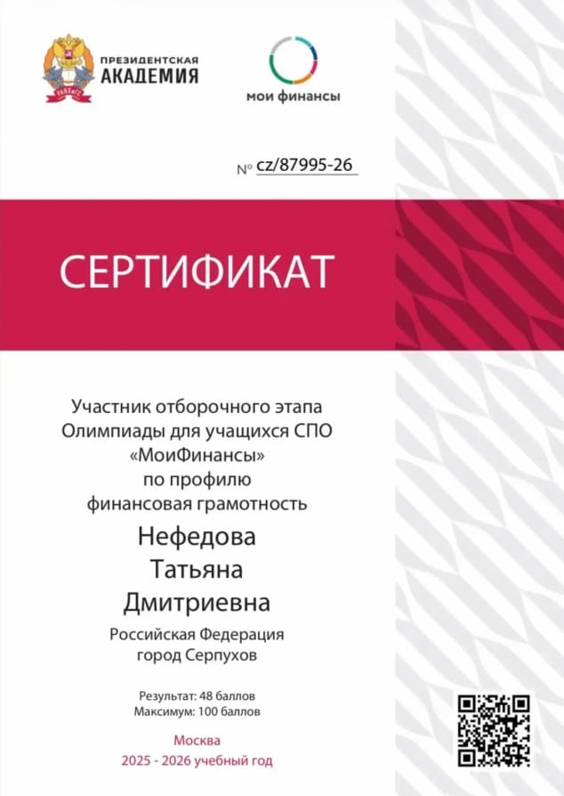 Студенты третьего курса Серпуховского колледжа из группы 1331 специальности «Банковское дело» недавно приняли активное участие в отборочном этапе Олимпиады «МоиФинансы». Это мероприятие включено в официальный список соревнований, способствующих развитию умственных способностей и творческого потенциала среди учащихся средних профессиональных образовательных учреждений. Подготовку осуществляла преподаватель спецдисциплин Вера Сергеевна Мастерских.