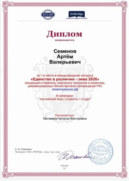 Студенты группы 1241 Селиванова Виктория, Шкиря Мария, Семенов Артем, Шестов Владислав, Шевяков Владислав (специальность «Информационные системы и программирование») второй раз в этом учебном году приняли участие в конкурсе, представив свою исследовательскую работу на тему «Неудача, успех и право на ошибку». Они сравнили отношение к таким фактам нашей жизни в русской и англоязычной культурах и выявили немало различий. Жюри конкурса, в состав которого входят лучшие преподаватели Москвы, присудило нашей команде 1 место.