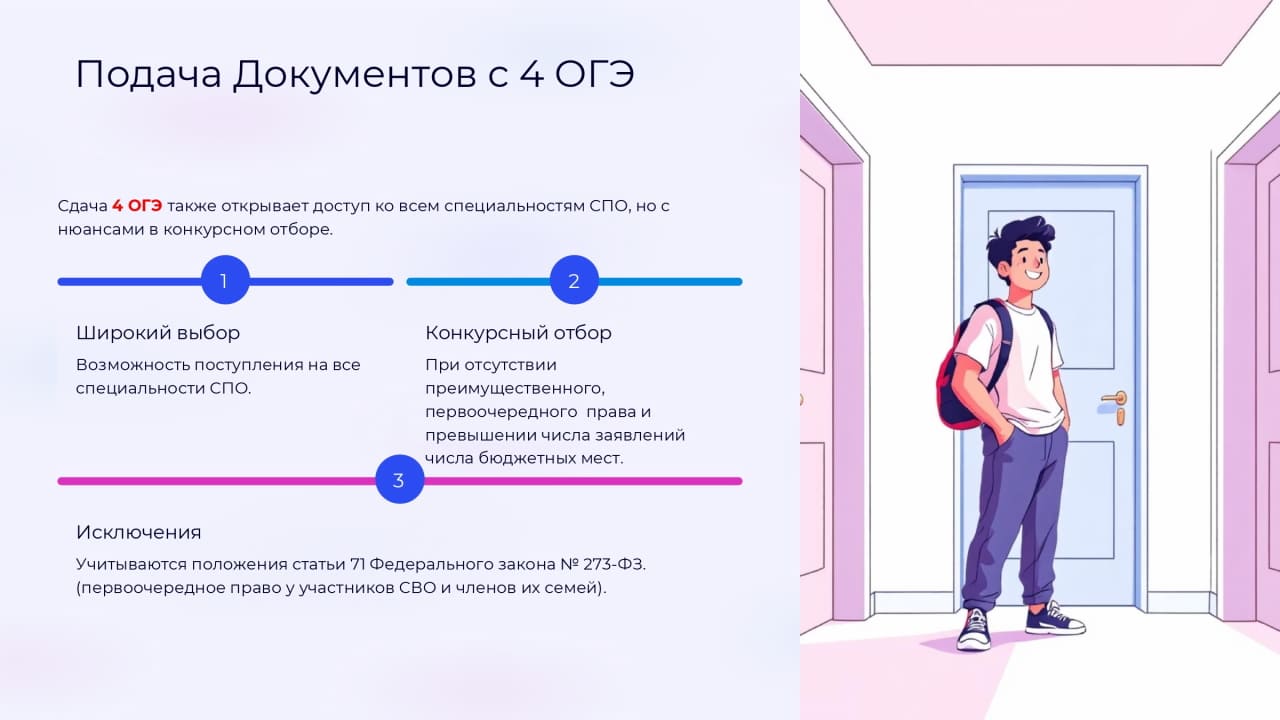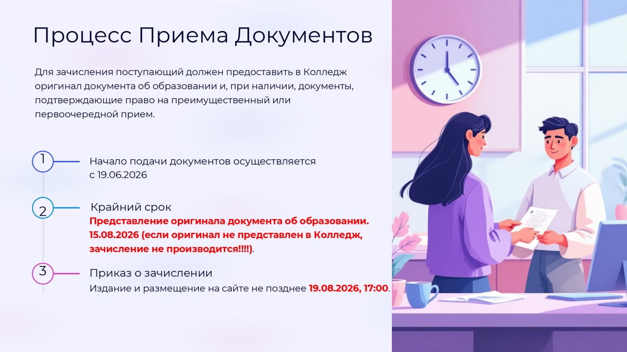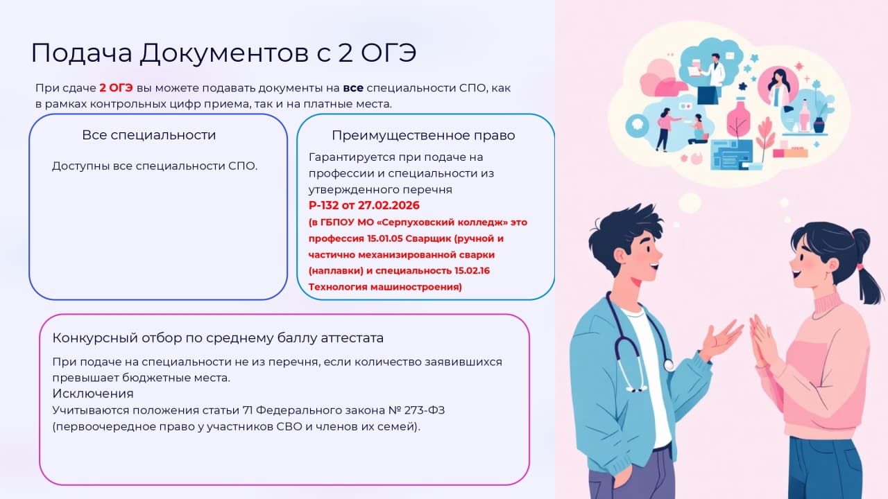 Заявление на обучение через Портал государственных услуг (https://www.gosuslugi.ru/)подается из личного кабинета абитуриента!!! Заявление через ЕПГУ можно подать очно с помощью специалистов приемной комиссии. Документы, необходимые для подачи заявления: Копия паспорта, документ о предыдущем образовании (аттестат, диплом), 4 фото. Перечень специальностей, по которым осуществляется прием в 2026 году. Прохождение предварительного медицинского осмотра не требуется. Вступительные испытания на специальности и профессии, по которым ведется прием, не предусмотрены. |