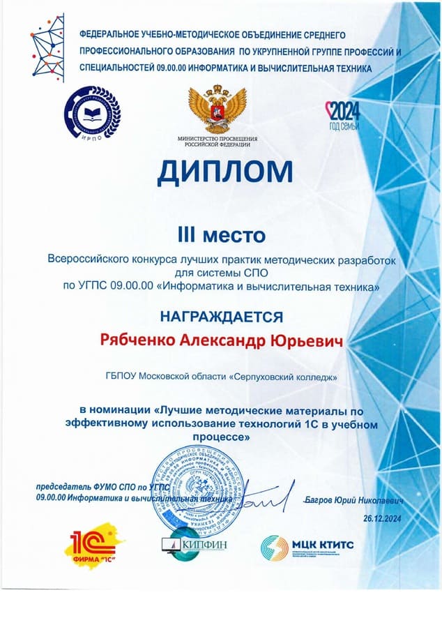 Диплом за 3 место в этой номинации получил преподаватель Серпуховского колледжа Рябченко Александр Юрьевич. Наградой за призовое место стала денежная премия в размере 50 тыс. рублей от Фирмы "1С", поддерживающей номинацию.