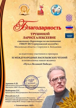 15 мая 2025 года в ДК «Выстрел» в городе Солнечногорске Московской области состоялась церемония награждения победителей и призёров XI Международных Васильевских чтений "Путь к Великой победе", которые проводились в рамках государственной программы посвящённой 80-летию Победы в Великой Отечественной войне, а также «Году мира и единства в борьбе с нацизмом».