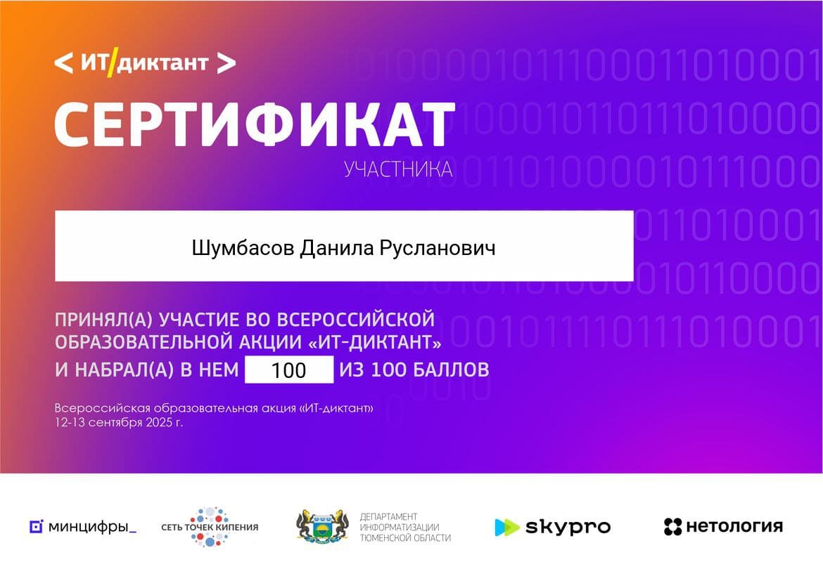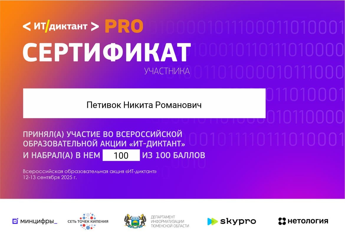 Участие в ИТ-диктанте - это отличная возможность оценить свой уровень цифровой грамотности, понять, какие знания нужно подтянуть, и повысить свою конкурентоспособность на рынке труда.