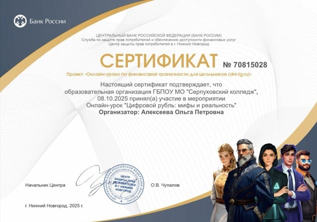 Студенты и преподаватели Серпуховского колледжа продолжают активно участвовать в серии уроков от Банка России. Уроки охватывают все темы финансовой грамотности от истории денег до инвестирования. У каждого модуля свой герой и локация, где разворачивается интересный сюжет.