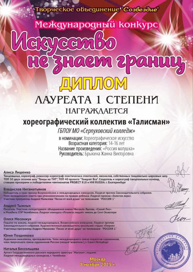 Хореографический коллектив "Талисман" ГБПОУ МО "Серпуховский колледж" принял участие в Международном конкурсе "Искусство не знает границ" " и стал Лауреато 1 степени!