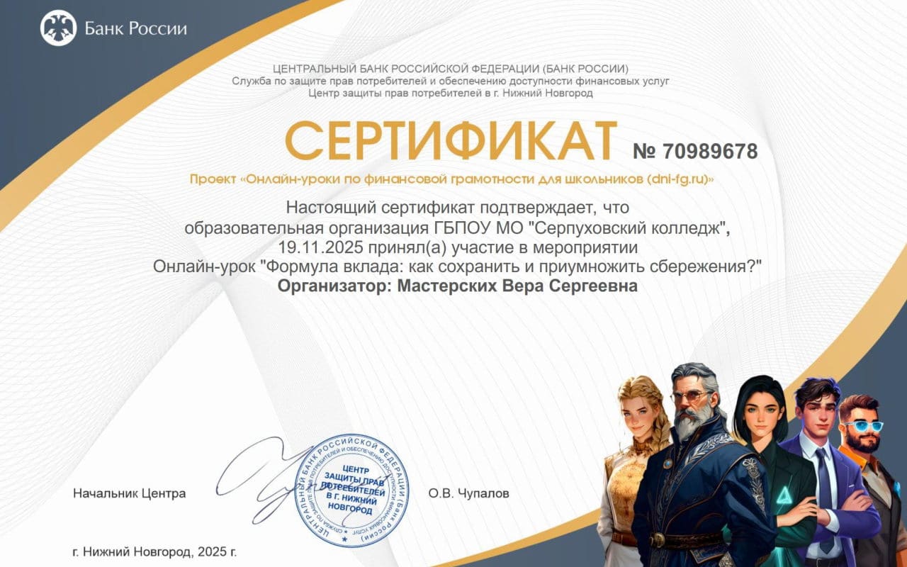19 ноября в Серпуховском колледже прошёл увлекательный урок финансовой грамотности от представителей Банка России. Тема встречи: «Формула вклада: как сохранить и приумножить?»