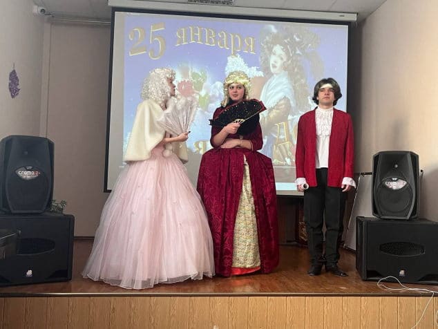 В анимационном представлении студенты первых курсов познакомились с историей праздника. Классический менуэт В.А. Моцарта в исполнении студенток 3 курса специальности «Туризм и гостеприимство» ФП «Профессионалитет нацпроекта «Молодежь и дети» перенёс зрителей в 18 век. Актёры показали момент подписания Императрицей Елизаветой Петровной Указа об открытии в Москве университета при активном участии графа Шувалова И.И. и Ломоносова М.В., а фрейлина украсила диалоги этой картины.